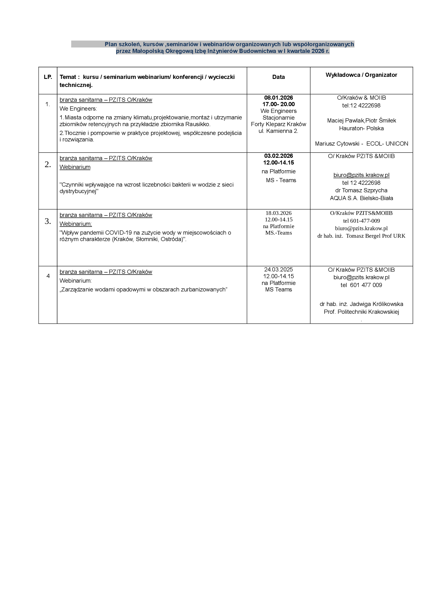 plan szkoleń PZITS O/Kraków na I kwartał 2026